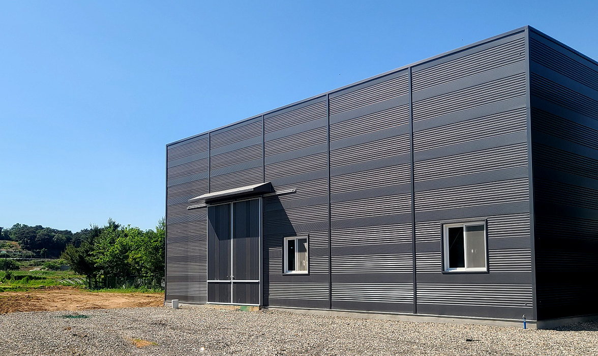 충청남도 아산시 둔포면 V70은 외부 골 모양에 따라 종류가 매우 다양하며 기본 색상인 은회색 부터 다양한 색상으로 생산이 가능하며 또한 특이색상도 맞추어 생상이 이루어지고 있다. 아산둔표 현장은 진회색으로 깔끔한 이미지와 통일감을 주어 건물자체가 커보이는 느낌을 줌.